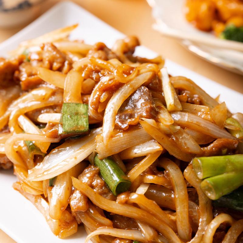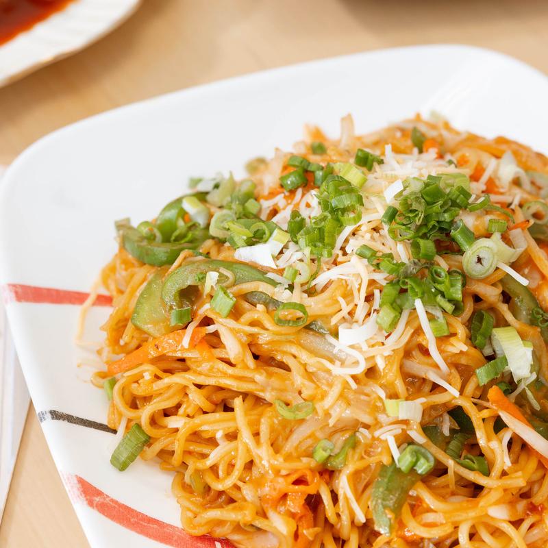Stir-fried noodles with onion, cabbage, green pepper, bean sprout, carrot, chef's sweet spicy sauce, cheese, scallions