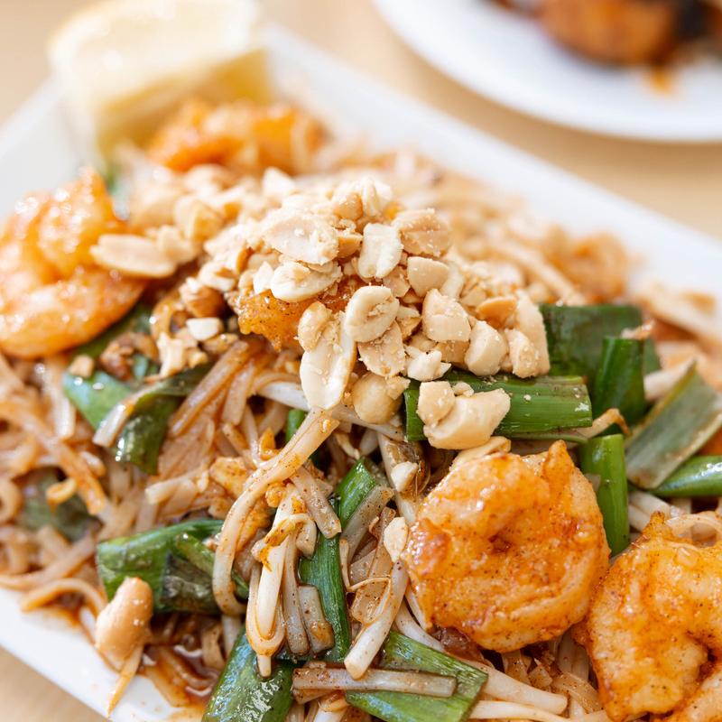 Choice of: Not Spicy, Mild, Medium, Extra Spicy • Thai rice noodle stir-fried with egg. bean sprout, scallions, fish sauce, peanut, lemon