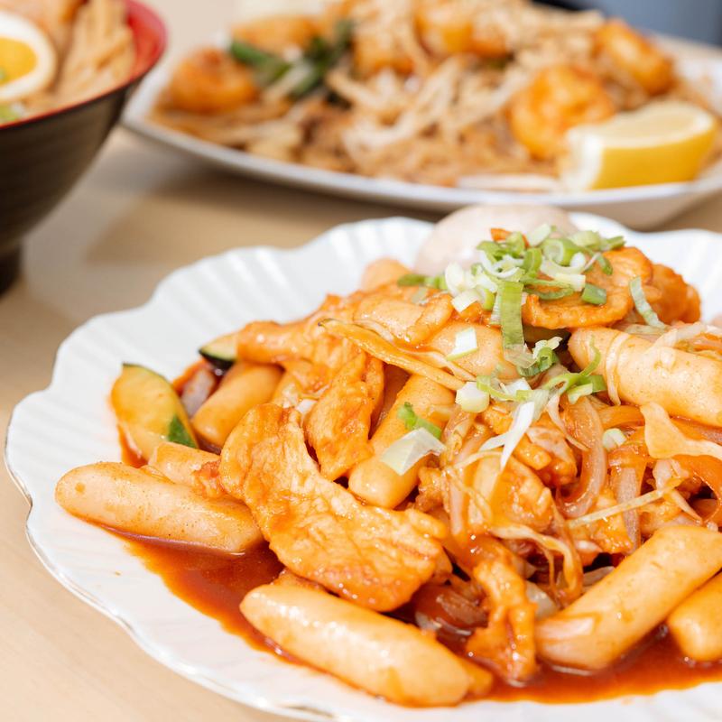 Stir-fried rice cake with nitamago egg, cabbage, onion, zucchini, chef's sweet spicy sauce, sesame, scallion