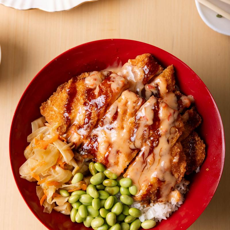White rice with breaded fried chicken, chef special seasoning, pickled cabbage, carrot, edamame, spicy mayo